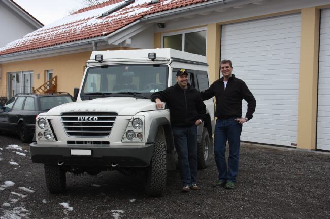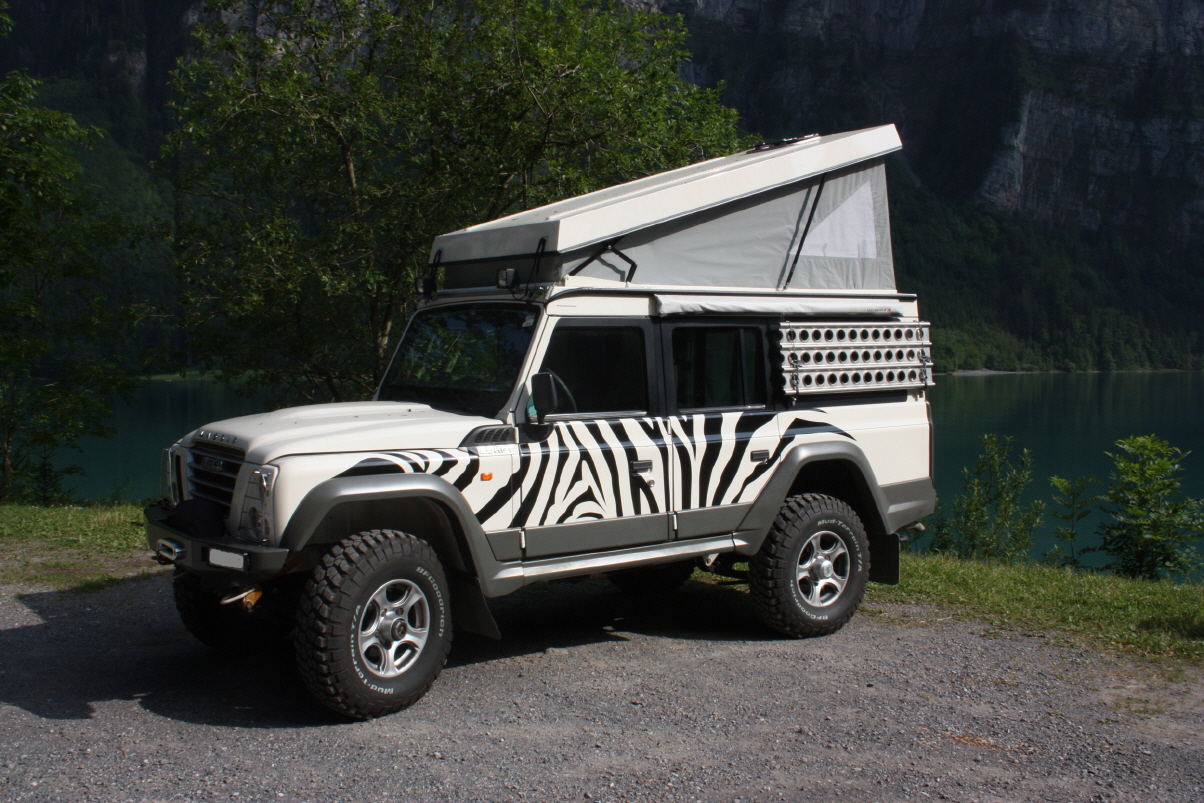 Der Massif, der mittlerweile in Deutschland nicht mehr angeboten wird, hat technisch und optisch eine verblüffende Ähnlichkeit mit dem 110-er Defender von Land Rover. Kein Wunder, dass das Dach aus dem Allgäu auch auf den Defender passt. Bernd Seyberth spendiert seinem Aufstelldach einen mit der Karosserie verschraubten Dachrahmen. Das geschraubte Serien-Dach aus Kunststoff wird abgenommen und gegen das Alu-Aufstelldach ausgetauscht. Der Kunde hat die Wahl zwischen glattem oder Riffelblech. Die Blechstärke sind so gewählt, dass die Dächer – unterstützt durch die integrierten Spriegel – begehbar sind. Der Lack auf dem begehbaren Dach ist durch eine transparente Lackschutzfolie vor Beschädigungen geschützt. Beim hier gezeigten Iveco bringen Zusatzscheinwerfer am abnehmbaren Lichtbalken Licht ins Dunkel.