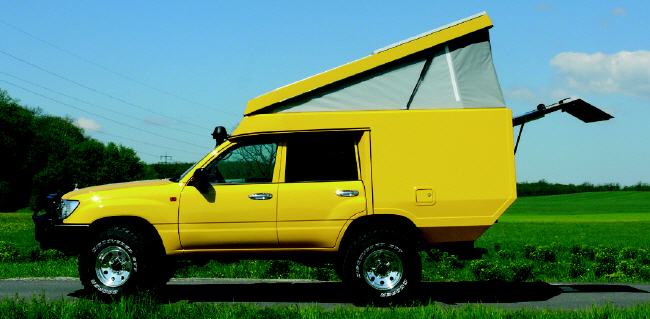 Die vergrößerte Dachfläche sorgt für Liegeflächen von bis zu 140 cm Breite. Bei einer Bettlänge von 220 cm bleibt damit ein Durchstieg von 60 bis 80 cm. Und auch nach dem Umbau verfügen die Fahrzeuge, abhängig vom Innenausbau, über bis zu fünf vollwertige Sitzplätze. Trotz des Gewinns an nutzbarem Innenraum erlauben die Außenabmessungen eine sichere Verschiffung im Container. Der Heckumbau erhöht, zusammen mit dem Klappschlafdach, das Fahrzeuggewicht (bezogen auf das serienmäßige Leergewicht) lediglich um etwa 50 bis 100 Kilogramm. Auch bei Tom’s Fahrzeugtechnik zu haben sind Aluminium-Klappschlafdächer für die Modelle der Toyota-Baureihen J8 und J10. Auch für zwei Erwachsene sollen sie ein ausreichendes Platzangebot bieten. Die Liegefläche ist 110 cm breit und zwei Meter lang. Die beiden seitlichen Gasfedern sollen ein leichtes Aufstellen des Klappschlafdaches ermöglichen. Der Zugang zur Liegefläche erfolgt durch ein geteiltes Liegebrett, so kann man die Schlafstatt vom Inneren des Fahrzeugs aus erreichen. Ein Alu-Klappschlafdach ist auch für Modelle der Baureihe J7 im Angebot. Dieses Klappdachmodell ist ebenfalls aus Aluminium-Riffelblech aus in Wagenfarbe lackiertem Aluminium-Glattblech zu haben.