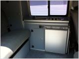 Der Ausbau ist robust und in Casemaker-Ausführung gehalten. Er teilt sich den Platz im Wohnraum des Bullis mit einer Schlaf-Sitzbank aus dem Hause Scopema. Üblicherweise findet man im „klassischen“ T5-Ausbau Möbel aus Pappelsperrholz mit Beschichtung. Da der T5 4motion nach seiner Fertigstellung umgehend in einem Container auf den Weg nach Kanada ging, war der deutliche Gewichtsvorteil des Casemaker-Prinzips gefragt. Die drei einzelnen Schrank sind federleicht und können bei Bedarf in kurzer Zeit entnommen werde.