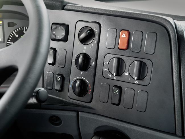 Für den Fahrer oder die Crew bringt die niedrige Kabine nicht nur einen bequemen Ein- und Ausstieg mit sich, sondern auch großzügige Platzverhältnisse innen. Der niedrige Motortunnel ist beim Durchstieg kaum im Weg, hinter den Sitzen ist Platz für Stauräume. Vom Boden bis zur Decke gibt dieser Freiraum hinter den Sitzen bis zu 1400 Liter Stauvolumen her. Vier DIN-Schächte nehmen auf der Stirnseite unterm Dach Gerätschaften, vom Radio bis hin zu Bordfunk, auf. Mittig auf dem Armaturenträger sitzt eine rutschfest ausgekleidete und mit hoher Stolperkante versehene offene Ablage mit zwei integrierten Becherhaltern. Ins Türfach ist je ein Flaschenhalter integriert.Die Crew nimmt auf drei vollwertigen und mit Gurtend Kopfstützen versehenen Sitzen Platz, die auf Wunsch auch luftgefedert lieferbar sind. Beide Sitzarten sind frei miteinander kombinierbar und mit Stoff- oder Kunstleder-Bezug zu bekommen.