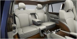 Die Fondpassagiere haben die Wahl zwischen einem Geschäftsmodus mit großzügiger Beinfreiheit, ausklappbarer Tastatur und vollwertiger Internet-Anbindung via iPad oder Tablet-PC oder einer entspannenden Ruheposition mit elektrischer Fußstütze, Getränketisch und einem Infotainment-Bildschirm für Filme. Die Fondsitze können elektrisch nach vorne geklappt werden, um Raum für Sportgeräte und Gepäck zu schaffen. Der EXP 9 F verfügt über eine klappbare Fondarmlehne mit Kühlfach für Champagner und Gläser. Die Sitzwangen sind mit an traditionelle britische Sportjacken erinnerndem, rautenförmig gestepptem Soft-Touch Leder bezogen.