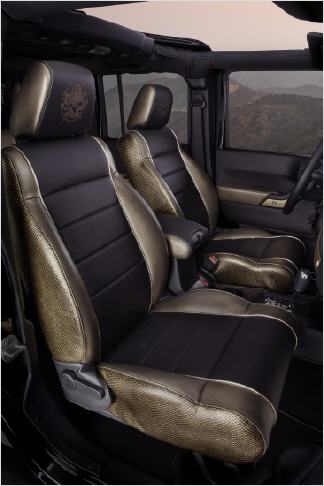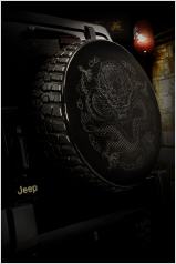 Der Wrangler Dragon basiert auf dem in China angebotenen Wrangler Unlimited Rubicon in Schwarz mit schwarzem Hardtop. Die Designer integrierten zahlreiche Details in Goldbronze, einer Farbe, die traditionell mit dem Drachen in Verbindung steht. Die Farb-Akzente finden sich innerhalb der typischen sieben Lüftungsöffnungen des Frontgrills, sie umranden die Scheinwerfer und zieren vorne und hinten die Jeep Logos. Weitere Akzente in Goldbronze finden sich auf der Motorhaube, den Schrauben für die Tankklappe und um die Heckleuchten sowie in Form einer chinesischen Drachen-Plakette an den Seiten und auf den Abdeckungen der Radnaben. Eindrucksvoll ist das große, in Goldbronze gehaltene Drachenmotiv auf der Kohlefaser-Geräuschdämmung unter der Motorhaube. Auch auf der Hochglanz-schwarzen Reserverad-Abdeckung am Heck findet sich ein Drachen in Goldbronze. Auf die 18 Zoll großen Fünfspeichen-Räder in Mattschwarz mit Felgenrändern in Hochglanz-Goldbronze sind 35 Zoll große Geländereifen aufgezogen.