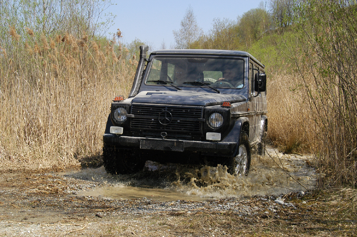 Der Rundkurs in Biberach bietet diverse Hindernisse aller Schwierigkeitsgrade, darunter Wasserdurchfahrten mit reichlich Geröll bis hin zu kopfgroßen Gesteinsbrocken. Passagen mit Schräglagen wechseln sich ab mit steilen Auf- und Abfahrten, schnellen Waldwege und Passagen, an denen der G schon einmal das Pfötchen hebt. Spektakulär schaut das vor allem in Steigungsstrecken aus – der Instruktor lässt die Fahrer hier ganz bewusst bei Bergauffahrt mitten im Hang anhalten. Die anfängliche Schrecksekunde weicht bei den Fahrzeugbesatzungen schnell großem Erstaunen. Doch, der G packt das. Problemlos und souverän fährt der Kult-Geländewagen wieder an und meistert ohne jegliche Anstrengung die Steigung. Ebenso wie Schräglagen, die bei den Fahrzeugbesatzungen zunächst mal für blasse Gesichter sorgen. Bei den Wasserdurchfahrten ist das Zutrauen in den Professional und seine Fähigkeiten schon so weit gewachsen, dass man dem Wagen die Durchquerung der Furten sofort zutraut. Erster Halt, Fahrerwechsel. Obwohl in vielen Fällen nicht geplant, klemmt sich hier und da, nein, fast überall, „die beste (Ehe-)Frau von allen“ selbst hinters Lenkrad. Das schöne Geschlecht entdeckt, unter sachkundiger Anleitung, dass Geländewagen Spaß machen können. Und dass der Professional andere Qualitäten hat als zentimeterdicken Teppichboden, elektrische Fensterheber und ein Armaturenbrett mit Wurzelholz-Einlagen. Und genau das hat der Veranstalter wohl auch beabsichtigt. Um dem Mann im Haus ein wenig Unterstützung angedeihen zu lassen, wenn er beim geplanten Neuwagenkauf den Professional auf die Liste setzt. Damit kann dann die nächste Urlaubsreise auch mal etwas anders ausfallen als in der Vergangenheit. Hier und da könnte es eine echt „wüste Tour“ werden. Mit dem G Professional als fahrbarem Untersatz. Angefixt in Biberach, bei einem Geländeausflug Ende April.