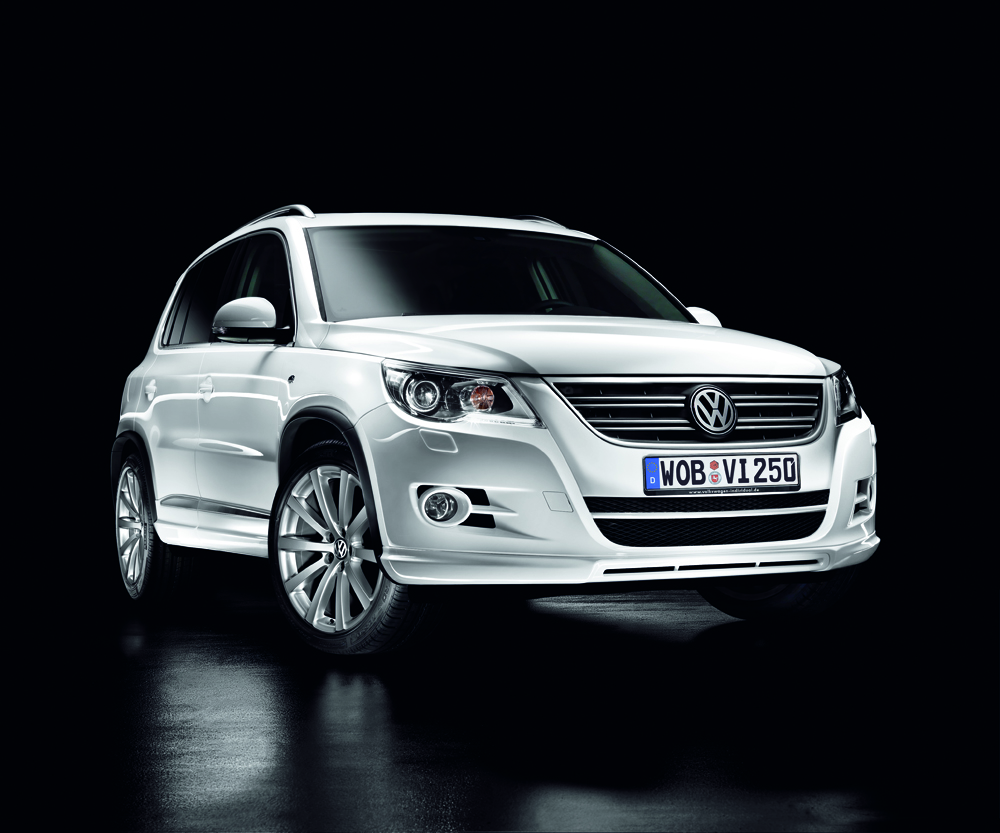 Etwa an den im unteren Bereich neu gestalteten und in Wagenfarbe lackierten Stoßfängern, dem im hinteren Stoßfänger integrierten Diffusor (schwarz genarbt) und dem Kühlerschutzgitter mit Doppellamellen in „Chrom matt". In der Silhouette sorgen schwarze Radlaufverbreiterungen und die in Wagenfarbe lackierten Seitenschweller für ein markantes Design. Chromeinleger in den Türaufsatzteilen sollen die sportliche Anmutung des Tiguan unterstreichen. An den Kotflügeln weist zudem ein Logo auf die sportliche R-Line-Ausstattung hin. An Bord ist auch das so genannte Dynamikfahrwerk mit einer sportlicheren Dämpferabstimmung.