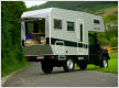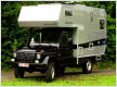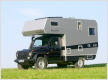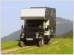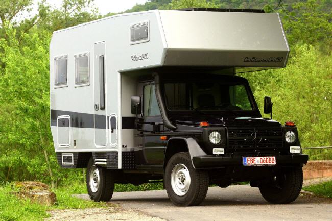 Auf dem Fahrgestellrahmen des G ist die Alkoven-Kabine von Bimobil mit den Original-Elastiklagern montiert. Der stabile Aufbau mit abtrennbarem Durchgang zum Fahrerhaus bietet im Heck, unter dem Kabinenboden, zwei Stauräume. Diese sind über Außenklappen in den Riffelblechschürzen zugänglich. Auf der Beifahrerseite ist Platz für das Reserverad, auf der Fahrerseite sind drei 20 Liter Reservekanister untergebracht. Optional kann auch ein zusätzlicher Dieseltank montiert werden.