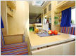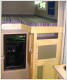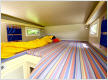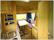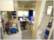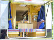 Der Grundriss der Wohnkabine, die über eine elektrisch ausfahrbare Doppelstufe betreten werden kann, ist schon beinahe klassisch. Eine große Vierer-Sitzgruppe im Heck, mittig auf der Fahrerseite das Sanitärabteil, gegenüber der Küchenblock. Und im Alkoven zwei Betten, die beim EX 328 als Längsbetten ausgeführt sind. Sie sind unterlüftet und beheizt und haben eine Liegefläche von 77 x 214 bzw. 77 x 207 cm, die auf elastischen Federelementen ruht. Das Pfiffige an den mit einem großen Mittelpolster verbundenen Längsbetten: Man kann aufstehen, ohne den anderen Schläfer zu stören, etwa, wenn man in der Nacht mal ganz dringend raus „muss“. Für den Zugang zur Liegestatt im „Oberstübchen“ hat Bimobil ausklappbare Trittstufen an der Seitenwand montiert. Unter dem Bett befindet sich der Kleiderschrank mit 115 cm Hängehöhe und 75 cm Tiefe. Ablagefächer an der Rückwand nehmen zusätzlich Kleidungsstücke auf. Gegenüber, rechts der Einstiegstür, reicht ein Schrank bis unter das Alkovenbett. Unten ist der von außen zugängliche Kasten für die Gasflaschen, darüber und daneben sind Staufächer eingebaut.
