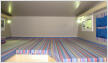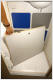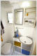 Der Sanitärbereich, mittig auf der Fahrerseite angeordnet, hat eine Grundfläche von 109 x 77 cm. Er bietet Duschwanne und –vorhang, Stahlwaschbecken, ein drehbares Cassetten-WC und farbig beschichtete Schränke. Für Warmwasser sorgt der zehn Liter fassende Boiler der Trumatic Combi 4 Diesel-Heizung.
