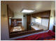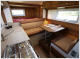 Im Anschluss ans Fahrerhaus, das per verschließbarer Tür vom Wohnabteil getrennt werden kann, liegt auf der Fahrerseite das Sanitärabteil mit Kassetten-WC, Dusche und Waschbecken. Die auf einem Doppelboden ruhende Vierer-Sitzgruppe mit Alcantara-Bezug ist mittig auf der Fahrerseite angeordnet. Direkt gegenüber befindet sich der Küchenblock mit Spüle, Abtropfbecken sowie Dreiflamm-Kocher und Backofen. Haushaltsarmaturen mit Einhebelmischer gehören in Küche und Bad zur Serienausstattung. Lebensmittel und Getränke hält ein 90 Liter fassender Kompressorkühlschrank kühl und frisch. Der Frischwassertank fasst 230 Liter, der Abwassertank ist 130 Liter groß, beide Tanks sind innenliegend und beheizt und damit frostsicher.