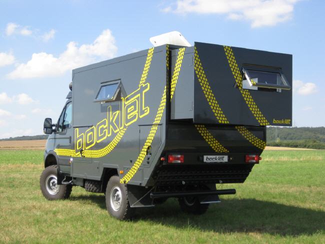 Der neue Dakar 630E basiert auf dem zur „Abenteuer & Allrad“ 2009 erstmals vorgestellten Bocklet Dakar 630. Der Wohnaufbau ist eine GfK-Sandwich-Konstruktion mit Wand- und Dachstärke von 50 mm, die Bodenplatte ist gar 60 mm stark. Türen und Klappen sind kältebrückenfrei, Stufenprofile und Hohlgummidichtungen schützen vor eindringendem Staub oder Wasser, Mehrfachverriegelungen sorgen für Sicherheit.