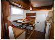 Die Kabine ist innen 3.875 mm lang, 2.050 mm breit und hat eine Höhe von 2.250 mm. Firmenchef Michael Bocklet setzt für den richtigen Durchblick auf KCT Echtglas-Ausstellfenster mit Verdunklungs- und Insektenrollos. Im Anschluss ans Fahrerhaus haben die Rheinländer auf der Fahrerseite eine Doppeldinette mit Alcantara-Polstern installiert. Gegenüber liegt – rechts der Einstiegstür – der Küchenblock. Der ist mit einem Zweiflamm-Kocher und einem 90 Liter fassenden Kompressor-Kühlschrank ausgerüstet.