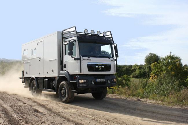 Als Antriebsaggregat steckt ein Diesel mit in Reihe angeordneten sechs Zylindern im Motorraum des MAN. Der Selbstzünder entwickelt aus 6,9 Liter Hubraum – per Turbo zwangsbeatmet – 206 kW / 280 PS. Damit der MAN auch abseits eines gut ausgebauten Tankstellennetzes über eine ordentliche Reichweite verfügt, hat Bocklet dem Fahrzeug insgesamt 675 Liter Kraftstoffvorrat verpasst. Auf dem Dach des MAN nimmt ein stabiler Gepäckträger Werkzeug oder Ersatzteile auf, vier dicke Scheinwerfer leuchten die Route auch im Dunkeln aus. Für den Komfort auf Reisen sind