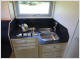 Hinter dem Fahrersitz liegt das Sanitärabteil der Wohnkabine, ausgestattet mit Kassetten-WC, Rundwaschbecken und Haushaltsarmatur mit Einhebelmischer. Für warmes Wasser und Duschvergnügen sorgt ein kombinierter Truma Gas-/Elektroboiler mit zehn Litern Inhalt. Zum Heck hin schließt sich die Winkelküche an, ausgestattet mit Zweiflammkocher, Spüle und Abtropfbecken.