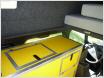 Absolut individuell ist bei jedem G von Desert-Service der Innenausbau. Der Kunde bestimmt die verbaute Technik und ihre Funktionen ebenso wie die Materialien und Farben. Beim hier gezeigten Fahrzeug sind im Bereich des hinteren Fußraums die Zusatzbatterie, das Ladegerät und die Standheizung in der Bodenplatte untergebracht. Gefertigt ist der Ausbau aus PVC beschichtetem Multiplex und Aluminiumprofilen. Auf der Beifahrerseite ist hinten die Sitzkiste montiert, davor ist ein von innen und außen zu beschickender Stauraum, auf dem die 35 Liter fassende Kompressorkühlbox steht. Der auf der Fahrerseite installierte Hochschrank mit seinen beiden Fächern kann von außen über die linke hintere Tür bedient werden, von innen sind weitere Staufächer zugänglich. Auf der Fahrerseite sind auch der 80 Liter fassende Wassertank, die Wasserpumpe und der Wasserfilter untergebracht. Waschbecken und Kocher kommen auf dem Hochschrank unter, die Klappe, die den Zugang zum Wassertank freigibt, lässt sich heruntergeklappt als Tisch nutzen. Die Hecktüren des G lassen sich auf 90 Grad öffnen, so gelangt man von hinten gut an die Staufächer des Ausbaus. Für den kompletten Innenausbau sind rund 9.500 Euro fällig.