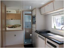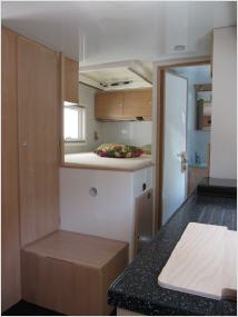 Der Ausbau selbst ist in echt Ahorn-furnierten und lasierten Stäbchenplatte ausgeführt. Die Küchenzeile bietet neben dreiteiligen Unter- sowie Hängeschränken einen zweiflammigen Gaskocher, eine Nirosta-Spüle und einen 100 Liter fassenden Kissmann-Kühlschrank. Die Sitzgruppe mit den beiden an den Längsseiten des Fahrzeugs angeordneten Sitzbänken kann bei abgesenktem Tisch zu einem Bett mit einer Liegefläche von 120 x 190 cm umgebaut werden. Ein weiteres Doppelbett befindet sich im Heck auf der Beifahrerseite, darüber bietet ein dreiteiliger Hängeschrank zusätzlichen Stauraum, ergänzt von einem raumhohem Kleiderschrank, und einer Flurgarderobe. Das Sanitärabteil ist mit Thetford Kassetten-Toilette und einem Turbo-Vent-Dachlüfter ausgerüstet.