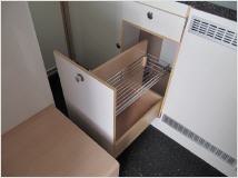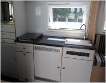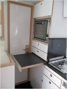 Im Ausbau punktet FF-Expedition mit einer Corian-Küchenarbeitsplatte mit integrierter Spüle und einem Apotheker-Auszug im Küchenunterschrank, ein Gasbackofen ist im Hochschrank integriert.