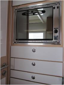 Wer noch ein paar Tausende mehr investiert, bekommt auch eine Heckabsenkung der Bodenplatte, für die Installation eines innenliegenden Abwassertanks (65 Liter Inhalt) und einer Werkzeugkiste, jeweils mit Außenklappe versehen. Obendrein gibt es dann auch vier KCT-Fenster mit Moskitonetz und Verdunklungsrollo sowie ein Fenster mit Rollo in der Eingangstür und zwei verchromte Wasserbefüllstutzen. Auf dem Dach ist eine 80 x 100 cm große, unverglaste Dachluke, installiert, am Heck befindet sich eine Ersatzradhalterung, die sechsstufige Ausziehleiter ist in einer Schublade untergebracht.