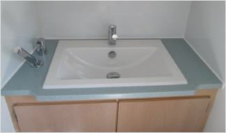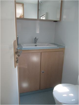 Im Bad gibt es ein Einbauwaschbecken, aus Corian gefertigt sind die Duschwanne und die Waschtischplatte, der Unterschrank und der sind Spiegelschrank als Schreinerarbeit ausgeführt.
