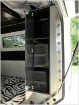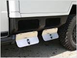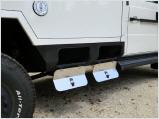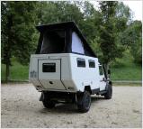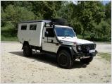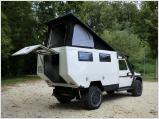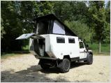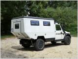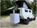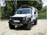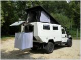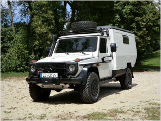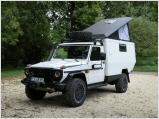 Die Wohnkabine ist im Heckbereich angeschrägt, um die Geländetauglichkeit des mit Aufbau 555 cm langen G nicht einzuschränken. Zum Schutz des Kabinenbodens gegen sich „aufstellende“ Sandbleche bei der Fahrzeugbergung sind Sandblech-Abweiser aus Edelstahl verbaut.