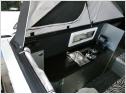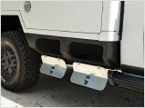 Eine mittig im Heck angeordnete Klappe gibt - über eine Leiter aus beschichtetem Alu - den Einstieg zum Wohnbereich frei. Bei geöffneter Heckklappe lässt sich außen ein Vorhang einhängen – die Außendusche (Aufpreis 577 Euro) ist bereit. In die Heckpartie sind LED-Rückleuchten eingelassen, die wartungsfreie Lampeneinheit ist vergossen und damit wasserdicht. Ein Schutzgitter bewahrt die Lampen vor Beschädigungen bei kleinen „Remplern“. Mit geringem Stromverbrauch glänzen auch die LED-Rückfahrscheinwerfer. Außen gibt es zudem Staukästen aus stabilem Alu (kunststoffbeschichtet) mit je zwei abschließbaren Klappen - etwa für Werkzeug oder Ersatzteile.