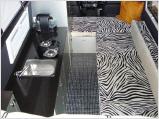 Für den Ausbau der Schränke und Schubladen der 290 cm langen und 173 cm breiten Kabine verwendet ORC Dibond, einen Verbundwerkstoff aus Aluminium und Kunststoff. Als Material für die Arbeitsflächen kommt Corian zum Einsatz, ein in über 100 Farben erhältlicher Verbundwerkstoff, der in seiner Struktur Marmor ähnelt, aber eine geschlossene Oberflächenstruktur aufweist.