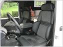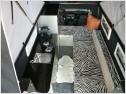 Längs auf der Beifahrerseite ist die Sitzbank untergebracht, die sich im Anschluss an das Fahrerhaus L-förmig bis über die Fahrzeugmitte erstreckt. In der rechten Möbelzeile gibt es reichlich Stauraum, dort ist außerdem ein tragbares WC untergebracht. Für den Fall der Fälle. Die Velours-bezogenen Polster der Sitzgruppe mit Kaltschaumstoff-Kern sind 100 mm dick.