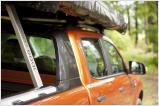 Dreilagig sind die Fenster ausgeführt: Moskitonetz, Fensterfolie und Zeltstoff. Wie die Fenster lassen sich auch die Türen insektendicht per Moskitonetz oder mit Stoff verschließen. Eine Stoffabdeckung des Panoramafensters sorgt für Schatten. Serienmäßig verfügt die „Ranger Wildtrack“ Sonderedition über einen Raumteiler. Der kann vor der Bettfläche als geschlossene (Sichtschutz-)Wand oder als Insektenschutz genutzt werden.
