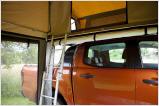 Nach Entfernen der schützenden Persenning wird das Dachzelt mit Hilfe der Einstiegsleiter zur Längsseite des Fahrzeugs hin aufgeklappt. Dadurch entsteht im „Obergeschoss“ eine Liegefläche in der Größe von 160 x 220 Zentimeter, ausgestattet mit einer hochwertigen, zehn Zentimeter starken Matratze.