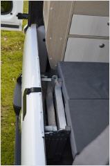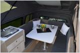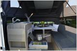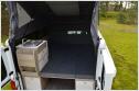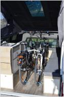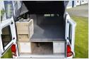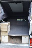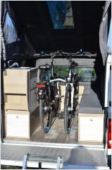 Den Innenausbau steuert Robel-Mobil aus Emsbüren bei, lieferbar ist er in verschiedenen Möbeldekoren wie etwa in Esche gekälkt oder in Erlefurnier. In wenigen Minuten lässt sich der komplette Möbeleinbausatz nach dem Lösen von acht Rändelschrauben herausnehmen, der Pick-Up ist so mit leerer Ladefläche für anfallende Transportaufgaben einsatzbereit. Um Fahrräder auf der Ladefläche mitnehmen zu können, sind in der Bodenplatte Einschlagmuttern montiert. Mit deren Hilfe können dort Fahrradschienen befestigt und die Bikes so ins Innere des Fahrzeugs geladen und sicher verstaut werden.