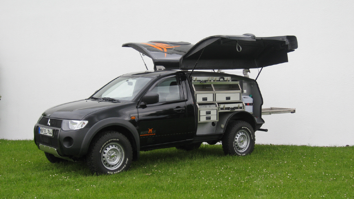 Als Basis für seinen Umbau hat Birker ganz bewusst den Mitsubishi L 200 in der Version mit einfachem Fahrerhaus und zwei Sitzplätzen gewählt. Der ist wendig, bietet ausreichend Drehmoment und Anhängelast als Zugfahrzeug (2.700 kg) und durch seinen Allradantrieb Geländetauglichkeit. Birker dazu: „Der Mitsubishi L 200 ist ein Nischenfahrzeug. Er bietet die Geländegängigkeit wesentlich größerer und schwererer Lkw, ist aber auch in innerstädtischen Bereichen problemlos zu handhaben“. Und mit rund 1.200 Kilogramm stimmt auch die Zuladung.