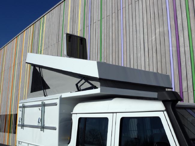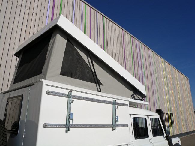 Ein Beispiel ist die Hardtop-Kabine mit Aufstelldach für den 130-er Defender. Dessen Kabine ist komplett aus Alu gefertigt, ohne Gitterrohr-Rahmen und daher praktisch frei von Kältebrücken. Isoliert ist die Kabine mit 20 Millimeter starkem X-treme-Isolator, als Innenverkleidung kommt zwei mm starkes Dibond in Weiß zum Einsatz. Für das Aufstelldacht greift Seyberth auf eine Scherenkonstruktion – statt einfacher Scharniere – zurück. So bietet das vorne angeschlagene Schlafdach im Fußbereich der Liegefläche mehr nutzbare Höhe. Als Zeltbalg wird Aisrtex-Stoff verwendet, drei Moskitonetze sorgen für frische Luft und halten fliegende Plagegeister draußen. Das robuste Dach ist begehbar, Zurrschienen dienen der sicheren Befestigung von Ladung.