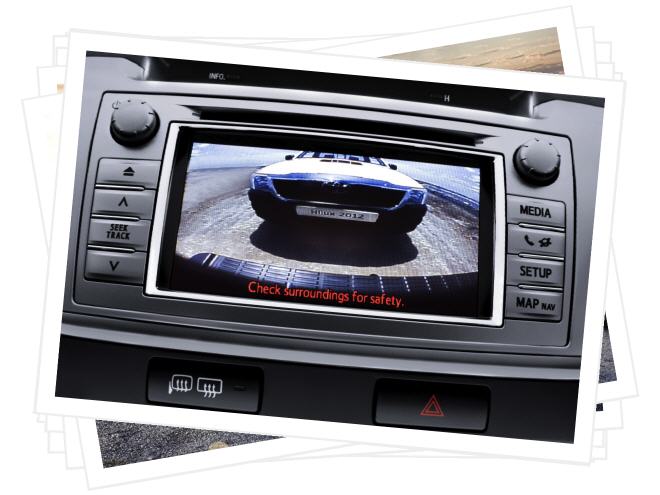 Außerdem können in iTunes enthaltene Album-Cover auf dem Display eingeblendet werden. Beim Einlegen des Rückwärtsgangs wird das Bild der Rückfahrkamera auf dem Farbdisplay wiedergegeben. Mit der optionalen Erweiterung Toyota Touch&Go ist der Hilux mit einem In-Car Navigationssystem zu haben. |