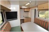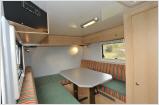 Dreh- oder Festtoilette mit Bordwasseranschluss. Das komplette Heck wird von einer großen U-Sitzgruppe eingenommen, die zu einem Doppelbett mit den Abmessungen 190 x 184 Zentimeter umgestaltet werden kann. Gegen einen Aufpreis von 1.320 Euro gibt es eine 140 x 160 cm große Heckklappe, mit der die Hecksitzgruppe zum Freisitz mutiert.