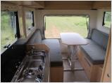 Der Innenraum des Autark Crosser hat eine Länge von rund drei Meter, das Fahrerhaus ist nicht in den Wohnbereich einbezogen. Es wird durch eine Tür von der Wohnkabine abgetrennt, wegen der besseren Isolierung. Fünf verschiedene Grundrisse offeriert Woelcke, außerdem eine Leerkabine zum Selbstausbau. Bei der Version C1 montiert Woelcke an der Trennwand hinter dem Beifahrersitz die Küche mit einer Kombination aus Zweiflammkocher und Spüle sowie einem Absorber-Kühlschrank (65 Liter). Hinter dem Fahrersitz ist die Nasszelle untergebracht, mit Duschwanne, Waschtisch und