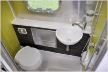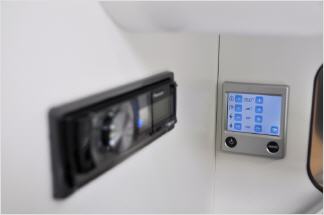 Einiges hat sich auch bei der Technik getan. Die komplette Bordelektronik wurde überarbeitet, sie bietet jetzt serienmäßig ein farbiges LCD Display für die Steuerung und Anzeige der Bordsysteme sowie einen integrierten Batterierechne, der die Restladung anzeigt. Als WC kommt eine Thetford Toilette mit Keramik Inlay zum Einsatz. Die Nasszelle hat an Größe gewonnen und besitzt serienmäßig eine transparente Faltwand vor der Tür als Spritzschutz.