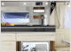 Das Küchencenter im Herzen des Fahrzeugs bietet eine große Arbeitsfläche und einen Drei-Flamm-Gaskocher mit darunter liegenden, ausziehbaren Schubfächern. Auf Wunsch gibt es die Arbeits- sowie die Waschtischplatte aus hochwertigem, pflegeleichtem Mineralstoff und sogar eine integrierte Spülmaschine, die sich im Küchenblock versteckt.
