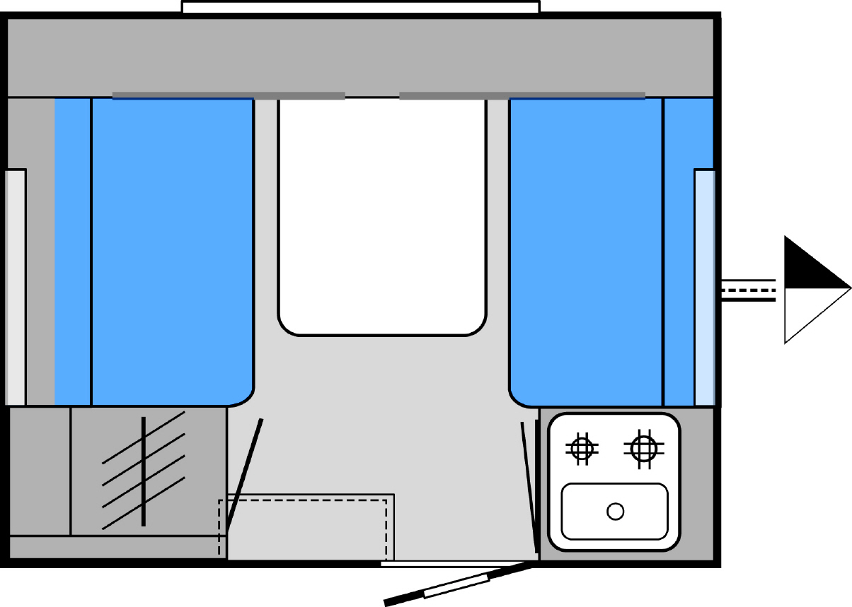 Links der Einstiegstür ist der Kleiderschrank mit Flaschenkasten installiert. Die beiden quer zur Fahrtrichtung angeordneten Sitzbänke (plus Tisch) bieten vier Personen Sitzplätze, umgebaut werden sie zum Doppelbett mit einer Liegefläche von 205 x 137 cm.