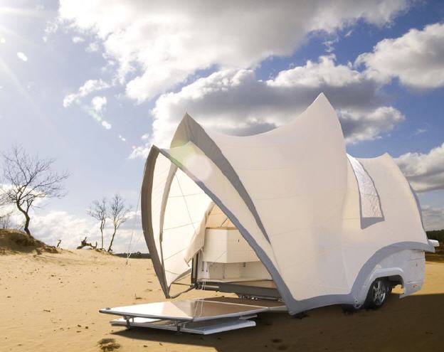 Irgendwie war es ja klar, ein solches Fahrzeug kann nur aus den Niederlanden kommen. Ein Faltcaravan mit üppigen Dimensionen, der auf den ersten Blick überhaupt nicht als rollende Behausung zu erkennen ist. Er steckt zusammengefaltet in einem unscheinbaren, stromlinienförmigen Hänger von gerade vier mal 1,80 Meter. Auf Knopfdruck entfaltet sich ein einzigartiger und beeindruckender Zeltcaravan mit einem Lebensraum von sagenhaften sieben mal drei mal 3,5 Metern.
