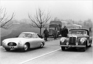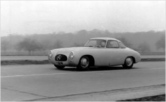 Das Fahrzeug wird zwei Tage später ausgewählten Journalisten auf der Autobahn Stuttgart–Heilbronn, der heutigen A 81, vorgestellt. Ein Foto zeigt den Sportwagen, der später zum Kult-Mobil avancieren sollte, in spätwinterlichem Ambiente. Neben ihm steht ein Mercedes-Benz 300 S (W 188), ein sportlich-luxuriöser Reisewagen, der dem neuen Sportwagen Teile seiner Technik spendiert.