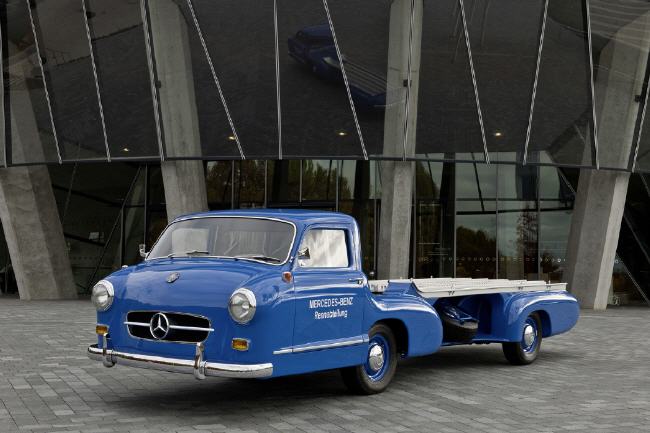 Jahrzehnte später baut Mercedes-Benz den spektakulären Renntransporter nach der Vorlage alter Fotos wieder neu auf. Er lässt die Zeiten von Rennsportlegenden wie Juan Manuel Fangio, Stirling Moss, Karl Kling oder Hans Herrmann wieder wach werden. Und die vom Grand-Prix-Rennwagen Mercedes-Benz W 196 und dem Rennsportwagen 300 SLR, die der Renntransporter auf seinem Rücken trug. Es sind Siegerfahrzeuge: Mercedes-Benz gewinnt 1955 die Weltmeisterschaft der Formel 1, die Markenweltmeisterschaft der Sportwagen und die
