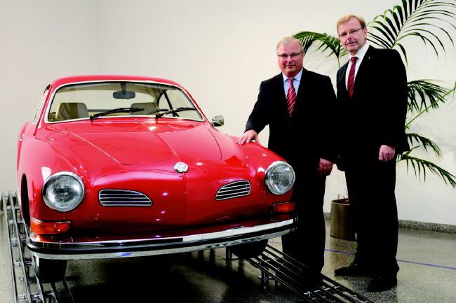 Das Foto zeigt Hubert Waltl, Mitglied des Markenvorstands Volkswagen Pkw für den Geschäftsbereich Produktion und Logistik, und Ludger Teeken, Sprecher der Geschäftsführung von Volkswagen Osnabrück, am Karmann Ghia Typ 14 Coupé.