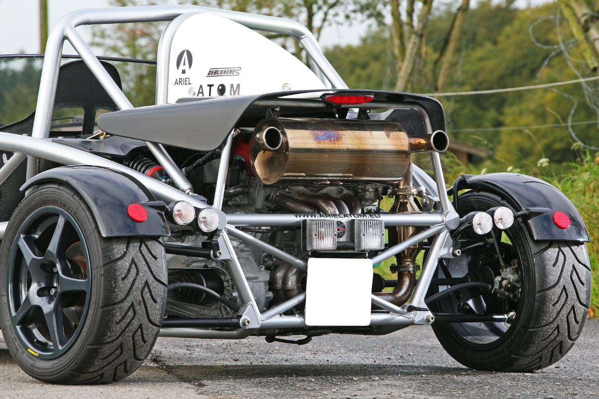 Einzigartig sind beim Atom seine innen liegenden Federbeine. Die Federung funktioniert mittels Push-Rods - die Federbeine liegen oben. Ein Gitterrohrrahmen ersetzt die Karosserie. Das bringt Steifigkeit, geringes Gewicht und Sicherheit für höchste Kurvengeschwindigkeiten.