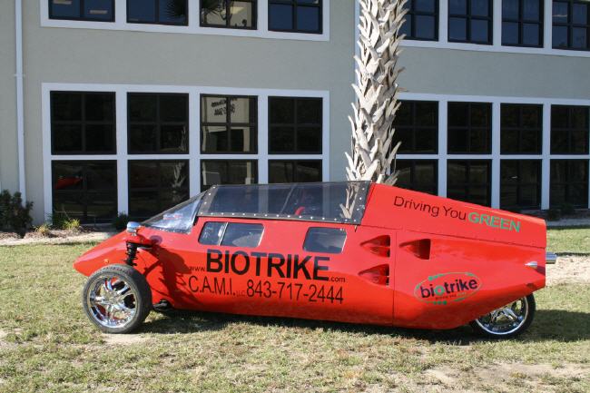 John and Julie Giljam, die Besitzer von Cool Amphibious Manufacturers International LLC (kurz: C.A.M.I.LLC) , ansässig in Ridgeland, Soith Carolina, haben sich einem neuen Betätigungsfeld verschrieben. Mit ihrem Team haben sie ein Dreirad konstruiert und designt, das Biotrike. Angetrieben wird das Fahrzeug, das optisch entfernt an einen Messerschmitt Kabinenroller erinnert, von einem Caterpillar C1.6 Dieselmotor, der mit Diesel oder Biodiesel befeuert wird.