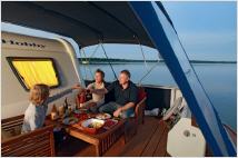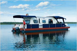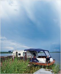Die Idee ist eigentlich simpel: Der Schwimmkörper-Spezialist Technus aus Teterow in Mecklenburg-Vorpommern montiert einen Hobby Excellent 560 auf einen zwölf mal vier Meter großen Katamaran. Und schafft auf diese Weise ein recht komfortables Hausboot. Zwei Reihen Schwimmkörper mit einem Volumen von je 450 Liter sorgen für Auftrieb und eine stabile Lage. Der Steuerstand befindet sich am Bug, so gibt es freie Sicht auf das Wasser und den Schiffsverkehr. Eine Rückwärtskamera ermöglicht den Blick auf den am Heck angebrachten Außenborder, mit den beiden Rückspiegeln kann man die Seiten bis zum Heck im Auge behalten. Neben dem Außenbordmotor besitzt der Katamaran zwei Bugstrahlruder, die das Manövrieren im Hafen erleichtern. Dazu gibt es maritimes Zubehör wie Anker, Klampen, Leinen und seetaugliche Lichterführung. Sie machen den schwimmenden Wohnwagen zu einem amtlich registrierten Motorboot. Durch Reduzierung der Fahrgeschwindigkeit auf zwölf km/h darf es führerscheinfrei gefahren werden. Mit dem WaterCamper Balu können die Müritz (der größte innerdeutsche Binnensee) und die angrenzenden, durch Kanäle miteinander verbundenen Gewässer der Mecklenburgischen Seenplatte, darunter Plauer See, Kölping- und Fleesensee, erkundet werden. Der WaterCamper bietet zwei überdachte Terrassen, eine Badeleiter und kindersichere Reling. Innen ist der Caravan für vier Personen ausgerüstet. Es gibt es im Schlaf-, Wohn-, Bad- und Küchenbereich 560 alles, was Camper (zu Wasser oder zu Land) benötigen. Mit einem Tiefgang von gerade 30 Zentimetern kann Balu mit dem Bug sogar aufs Ufer fahren und im Wortsinne Wasser und Land verbinden. Die Crew kann so in einer einsamen Bucht für ein paar Tage vor Anker zu gehen und Ferienglück à la Robinson Crusoe zu genießen. Entsprechende Ver- und Entsorgungsmöglichkeiten wie auf einem Campingplatz bieten zahlreiche Sportboothäfen im Gebiet der Mecklenburgischen Seenplatte. Balu, der WaterCamper kann über die in Waren ansässige Firma „Charterpoint-Müritz“ (www.charterpoint-mueritz.de) wochenweise angemietet werden. Die Preise liegen, je nach Saison, zwischen 499 und 1.099 Euro pro Woche.