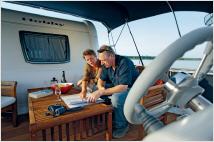 für das mobile Ferienvergnügen – auf dem Wasser oder zu Lande – unerlässlich ist. Etwa eine komplett ausgestattete Küche mit Edelstahlspüle, 112 Liter fassendem Kühlschrank mit Gefrierfach und dreiflammigem Gasherd. Im „Salon“ gibt es einen Flachbildfernseher und ein SAT-TV/DVD-Soundsystem.