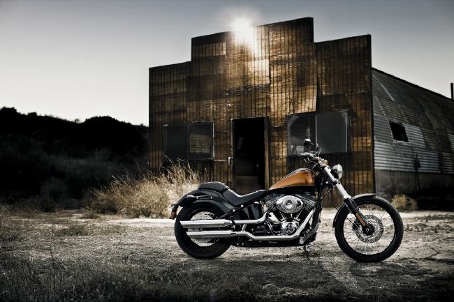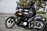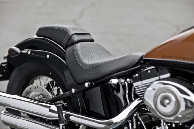 In gerade mal 660 mm „Höhe“ nimmt der Fahrer Platz. Noch nie saß man auf einer serienmäßigen Harley niedriger. Die Hände umfassen den neuen Split Drag Lenker mit innenliegender Kabelführung. Der Lenker ist direkt an der oberen Gabelbrücke montiert, auch der Tacho findet dort seinen Platz. Die Stiefel ruhen auf polierten, vorverlegten Rasten. Eine Lücke vor dem Sitz gibt den Blick auf den Rahmen frei, er trägt, ebenso wie die Schwinge und die Fenderhalter, mattes Schwarz. In glänzendem Schwarz ausgeführt sind die Tauchrohre, die Gabelbrücken und der neue 146 mm Scheinwerfer. Zu den wenigen verchromten Bauteilen des Bikes gehören – als Kontrast – der ovale Luftfilter und die Shotgun Auspuffrohre.