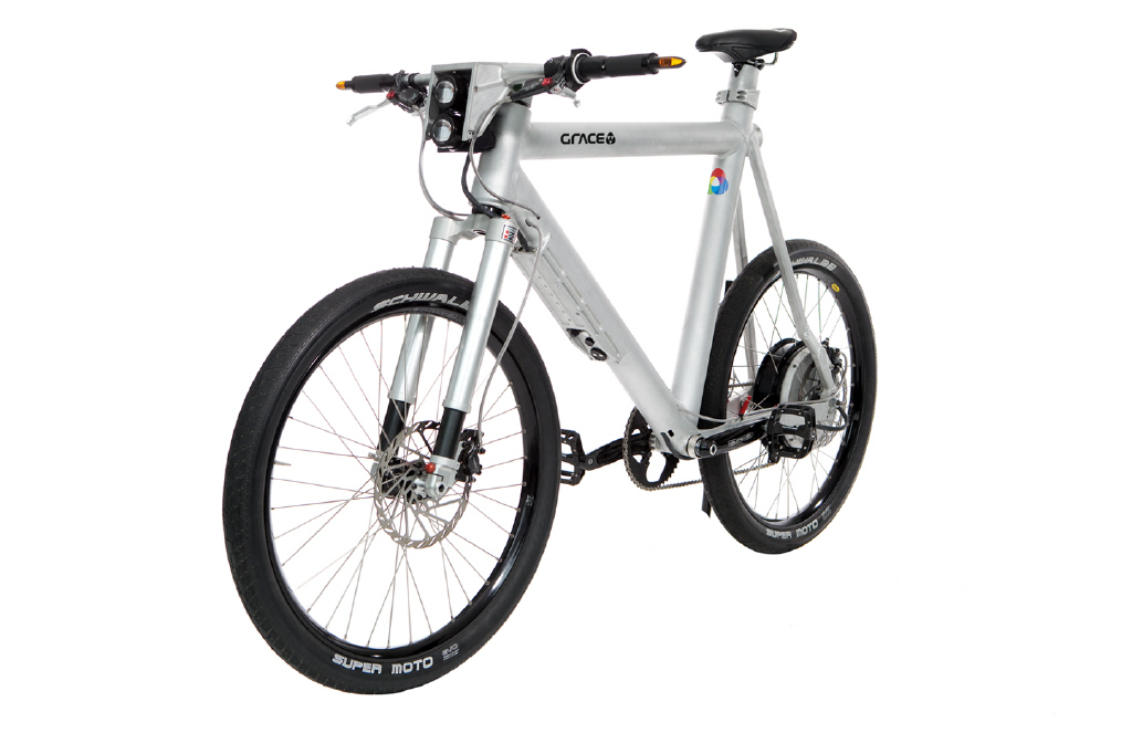 Die 32 Kilogramm schwere Grace (was soviel wie Anmut heißt) soll ein neues, schnelles, Mobilitätsverhalten im urbanen Ballungsraum ermöglichen. Und nebenbei Umweltbelastungen und Parkraumnot reduzieren. Mit seinen Mitarbeitern und Zulieferern entwickelt Michael Hecken, der Gründer und Erfinder von Grace, individuelle E-Motorbikes. Mit 1 300 Watt soll die mit Lithium-Ion Batterien ausgestattete Grace eine Geschwindigkeit von 45 km/h (bei einer Reichweite von rund 50 Kilometern) erreichen. Modifiziert sollen bis zu 65 km/h drin sein – was für die Straße jedoch nicht legal wäre. Der Motor ist direkt im Hinterrad untergebracht. Seine Energie bekommt das Antriebsaggregat von einem 13 AH starken Li-Ion-Akku, der steckt in den 70 und 78 mm starken Alu-Rohren des Rahmens.