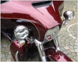 Kaum stehen wir, kommt dann doch wieder die Tusse in mir heraus. Ich habe eben keinen maskulin-androgynen Kurzhaarschnitt im Stile einer Brigitte Nielsen - und auch keine knitterfreien Glatthaare. Hmh. Und Helme sind nun mal auch nicht unbedingt Frisur-freundlich. Das Wissen darum, gepaart mit meiner haartechnischen Eitelkeit, lässt mich sofort den Außenspiegel der Harley nutzen. Oh, oh. Gott, der ist aber klein! Ich seh' ja nix. In meinem Cabrio verwirbeln die Haare auch. Etwas jedenfalls. Schließlich hat der Mini ja ein Windschott. Aber da habe ich Innenspiegel, um mal rasch und für andere "fast unmerkbar" die Lage auf dem Kopf zu checken. Und bei Bedarf fix für Ordnung zu sorgen. Wie soll das hier gehen? Blöde eitle Kuh, denke ich über mich selber. Aber trotzdem rausche ich im Café erstmal aufs WC. Sicherheitshalber. Und denke über die Möglichkeit nach, wie man wohl im Deckel des Topase einen Spiegel montieren könnte. Müsste doch gehen, eigentlich. Autsch!