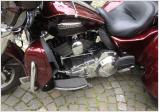 Einparken. Diese nächste Disziplin umgehe ich geschickt, indem ich die Maschine einfach auf den breiten Gehweg lenke und dort abstelle. Und die Ausrede für die eventuell kontrollierende Obrigkeit habe ich mir auch schon geistig zurechtgelegt. Eine unsinnige und überflüssige Maßnahme, wie sich dann im Tagesverlauf zeigen wird. Das Trike hat zwar eher den Platzbedarf eines Pkw denn eines Motorrads, aber es geht alles recht einfach. Der Lenkeinschlag ist völlig ausreichend, um auch mal eng zirkeln zu können. Man kippt ja nicht, und ein Rückwärtsgang wäre zur Not auch noch da. Ich gewöhne mir aber an so zu parken, dass die Maschine eben steht. Oder so, dass ich sie rückwärts aus den Parklücken heraus rollen lassen kann. Denn schieben ist bei dem Gewicht der dreirädrigen Harley echte Arbeit.