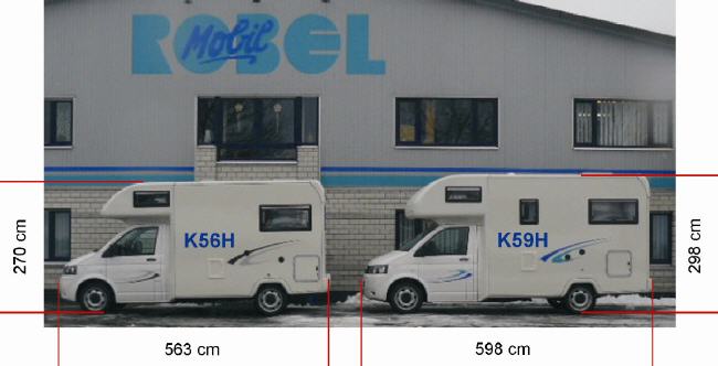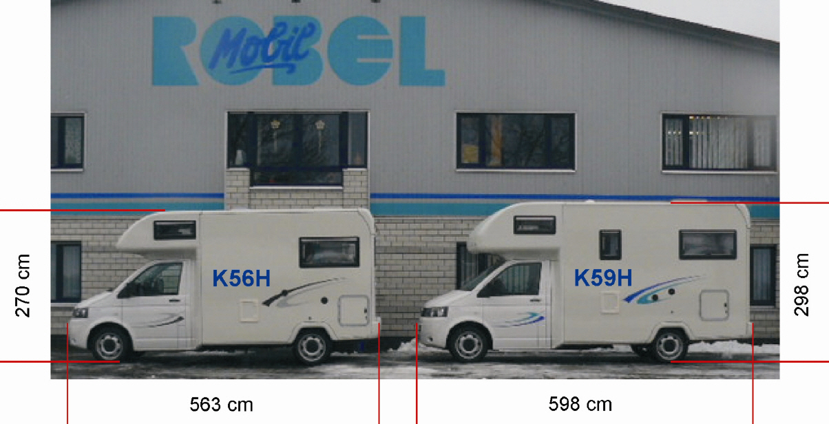 Ein familienfreundliches Alkoven-Mobil von Robel feiert auf der Basis des VW T5 Premiere. Zurück im Programm ist „der Kleine“K 56H mit seiner gemütlichen Hecksitzgruppe. Das völlig nüchtern mit Ziffern und Buchstaben benamte Reisemobil ist 563 cm lang und hat eine Außenhöhe von 270 cm (Breite 210 cm), als K 59H ist das Mobil knapp sechs Meter lang und 298 cm hoch.
