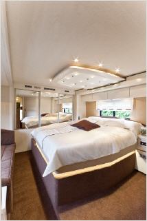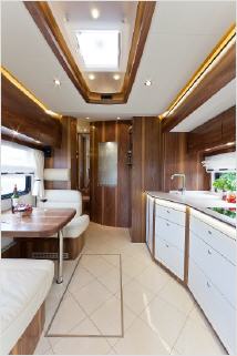 Wie nicht anders zu erwarten dominieren im Wohnraum erlesene Materialien. Der Möbelbau im Schlafraum ist in Schleiflack gehalten, dazu gibt es einen Sternenhimmel unter einer saturierter Glasplatte. Zum Nussbaum im Wohnraum passt der farblich abgesetzte Küchenblock mit seinen cremeweißen Fronten und der Corian-Arbeitsplatte mit Nussbaumeinlage. Die cremeweiße Leder-Polsterung und elektrisch verstellbare Ledersessel im Innenraum sind da kaum noch der Erwähnung Wert. Entspannung bieten sensibel steuerbare Lichtinseln, die BOSE Surround-Anlage und das Badezimmer mitsamt flächenbündig in den Boden eingelassener Eckdusche mit Rainshower Duschkopf, Handbrause und integriertem Sternenhimmel. Eine behagliche Atmosphäre auch in kalten oder warmen Regionen oder Jahreszeiten schaffen integrierte Klimaanlagen und Warmwasser-Fußbodenheizungen. Das alles hat natürlich auch seinen Preis. Der liegt für den Vario 1200 Platinum in „Normal“-Ausstattung bei schlappen 1,1 Millionen Euro.